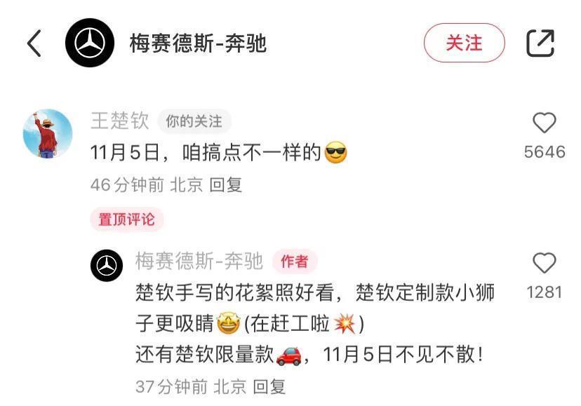 奔驰发了这组照片,说是楚钦休息时候拍的花絮,昨天的西装视频,今天的这一组造型,都拍的超级好。这一组照片,确实很麦当劳,颜色搭配超级漂亮,王楚钦是属于什么衣服都可以驾驭的类型,很帅气哦。王楚钦评论:“11月5日,咱搞点不一样的”奔驰回复:楚钦手写的花絮好看,楚钦定制的小狮子更吸睛,还有楚钦限量款的车”听话,奔驰,咱定制的小狮子和毛巾一样,单独销量吧,要是买车才能得到的话,一批人得疯11月4日,是莎莎的生日,这一天莎莎的品牌方们都会发力,楚钦说5日,那就是特意避开了4日这一天了吧。网友开玩笑说“有本事11月4日搞点不一样的呗”两个有巨大流量和人气的人,如果在同一天做活动,不敢想象会是怎样的场景期待这两天的到来!